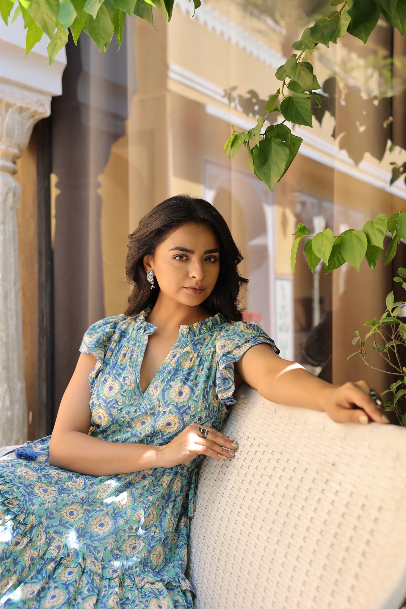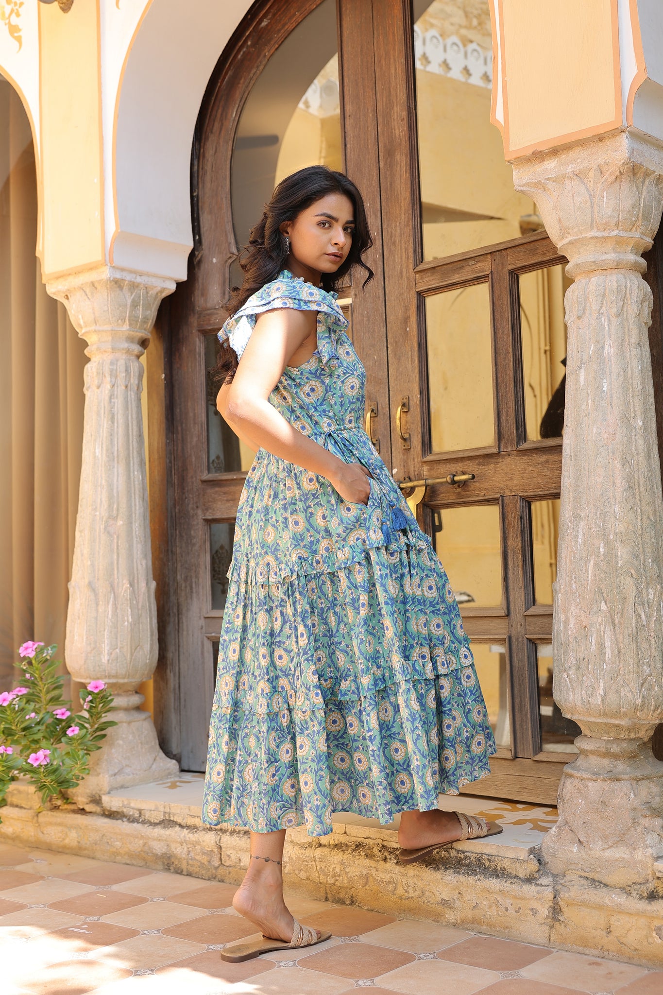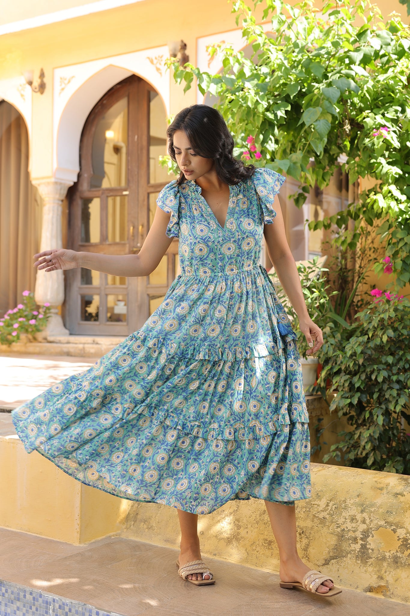 ruffled tiers , ruffled sleeves, adjustable waist and it has pockets too! the skirt is lined!