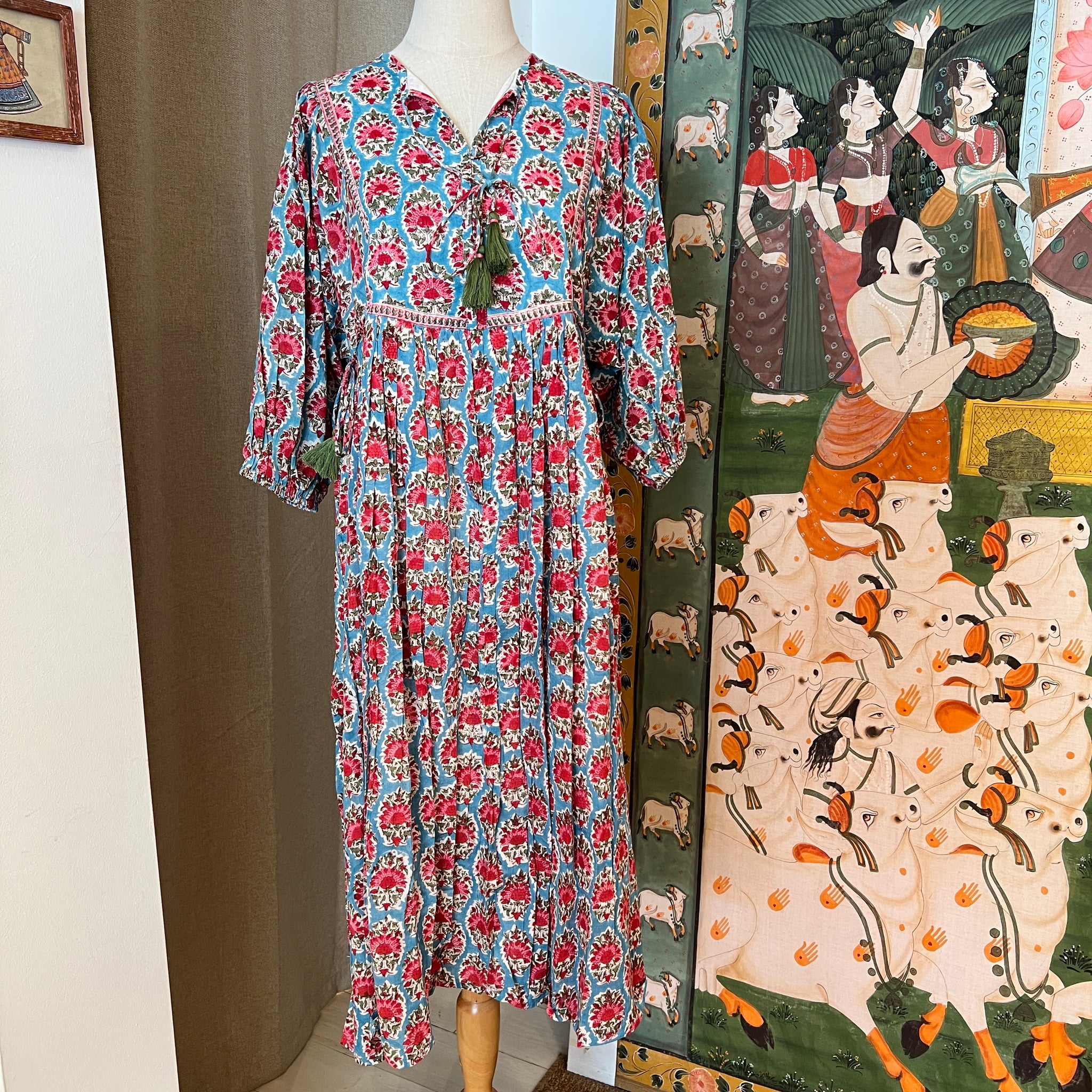 The midi dress - fun bohemian pull over dress with adjustable ties at high waist. 3/4th sleeves , flowy sillhouete, half skirt lined, easy breezy and yes it has pockets… made in the softest handblock printed cotton.