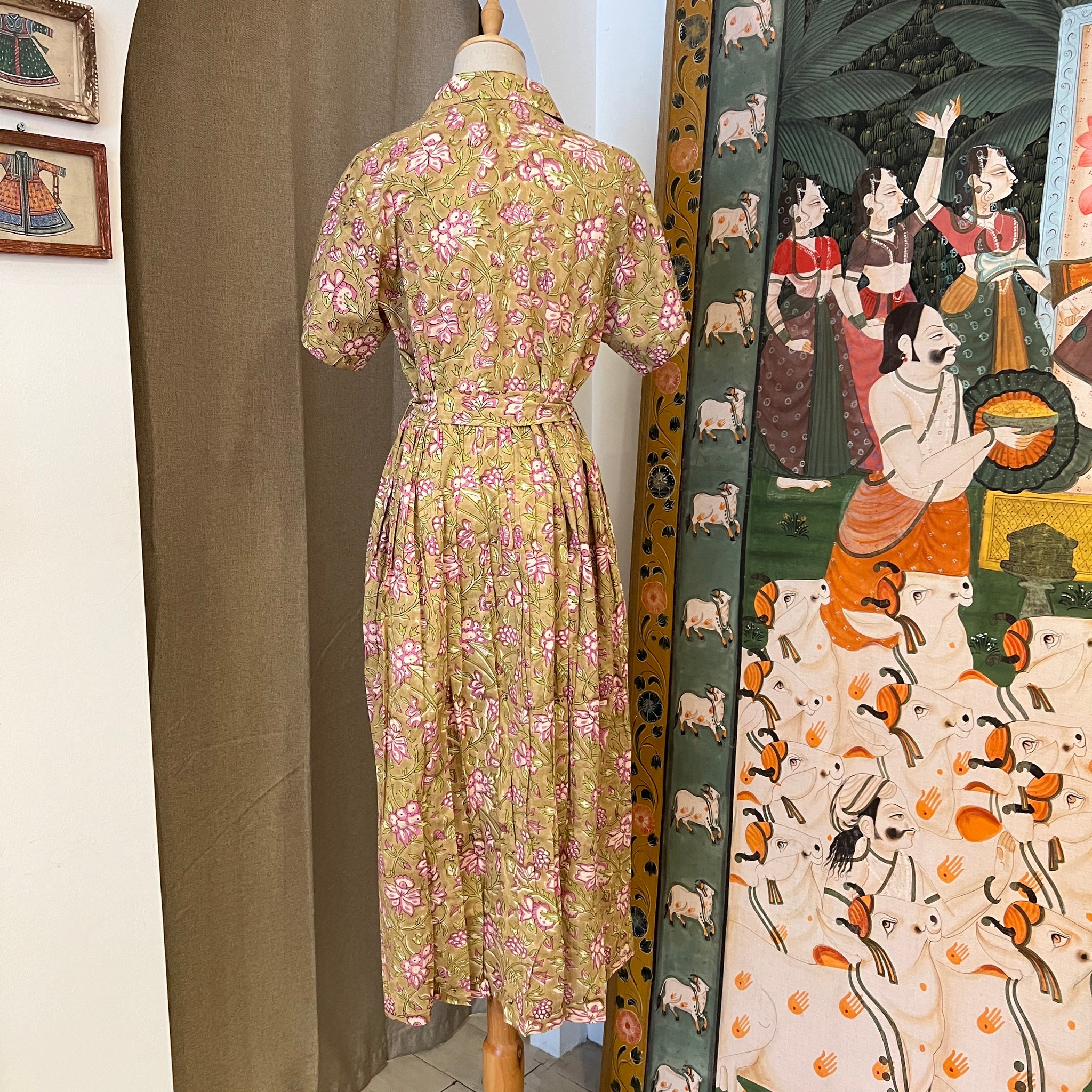 Hand block printed cotton midi dress, pleated , has pockets and belt to tie at the waist!!