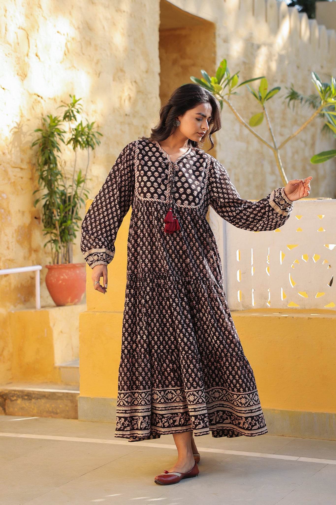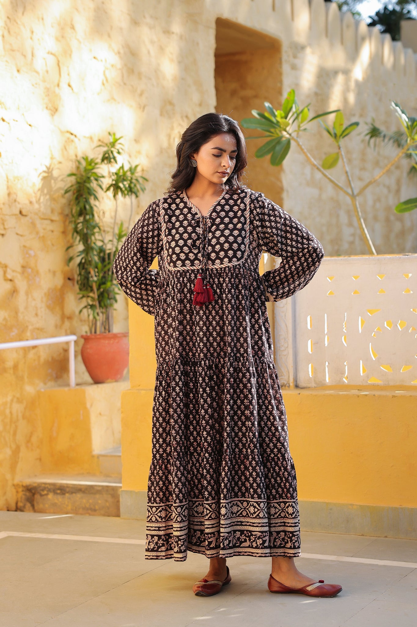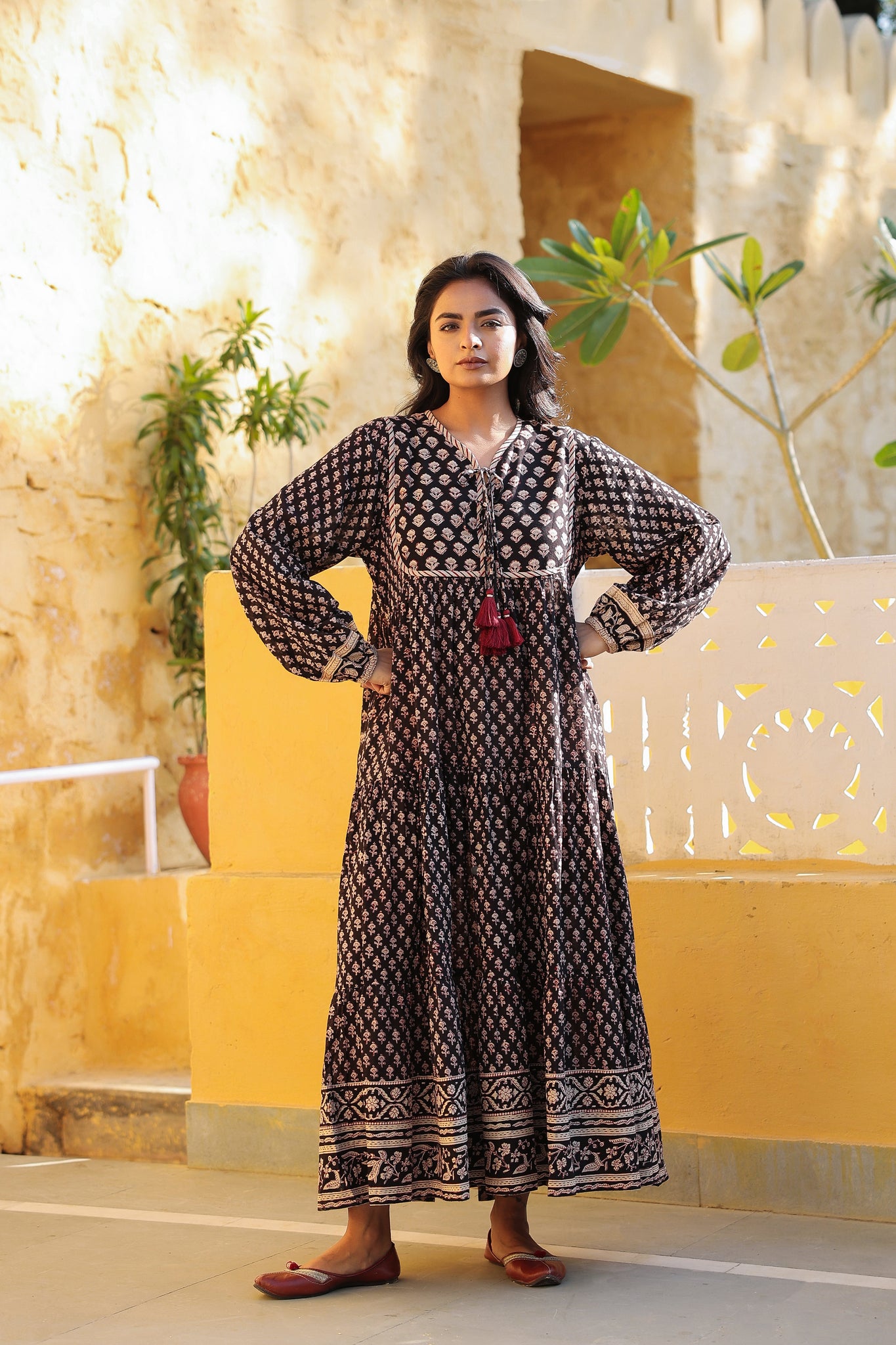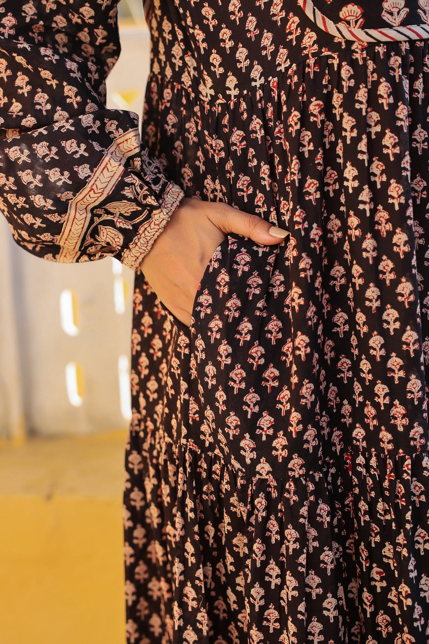 Hand block printed cotton maxi tiered dress with pockets and tassels.