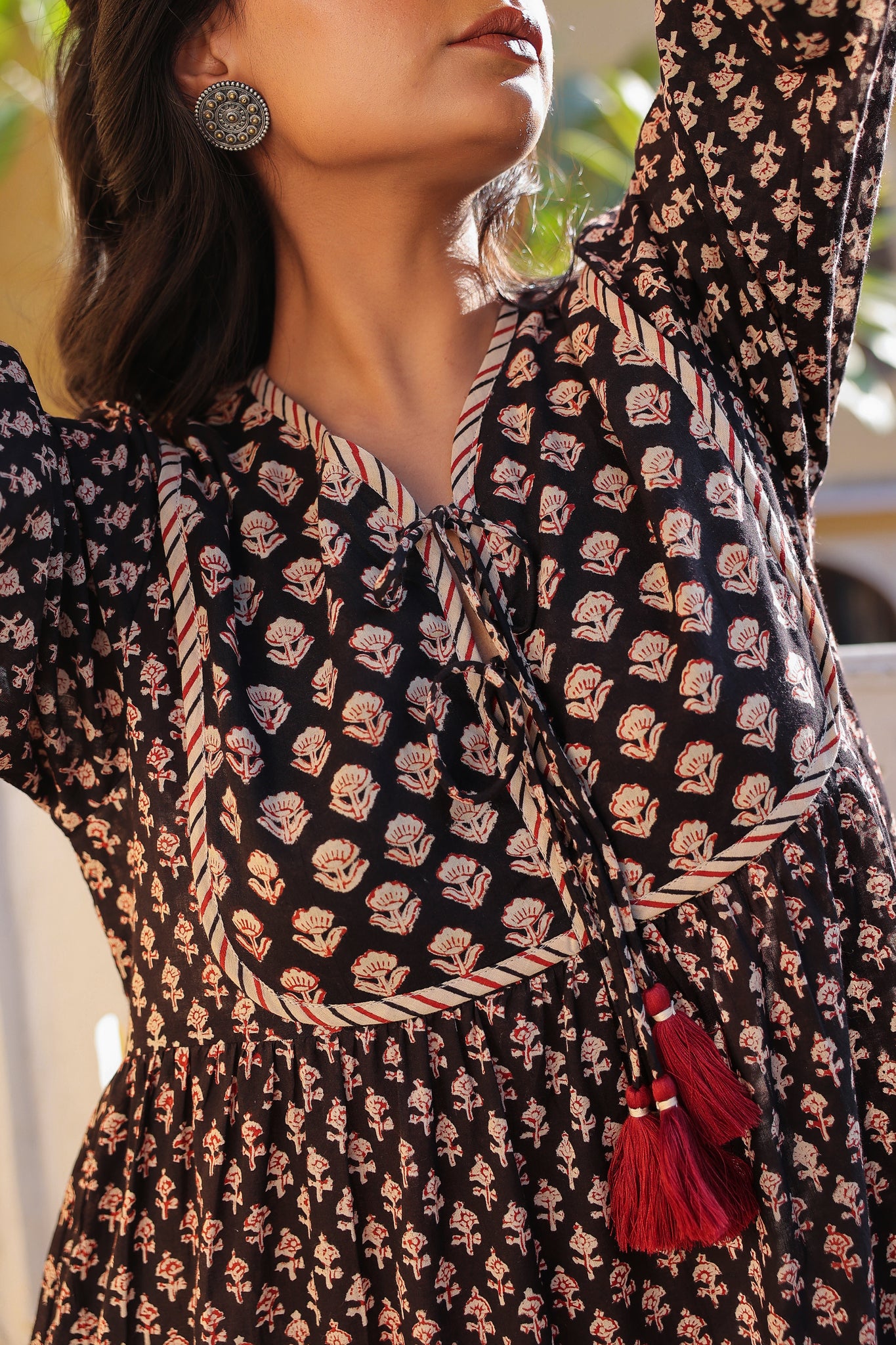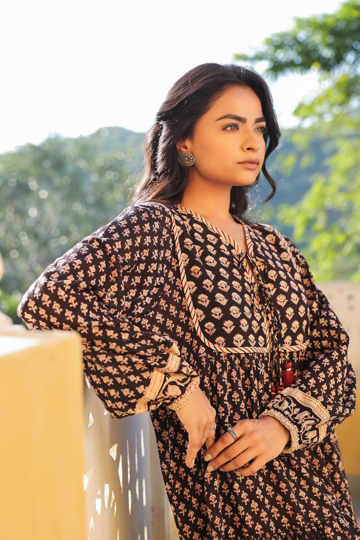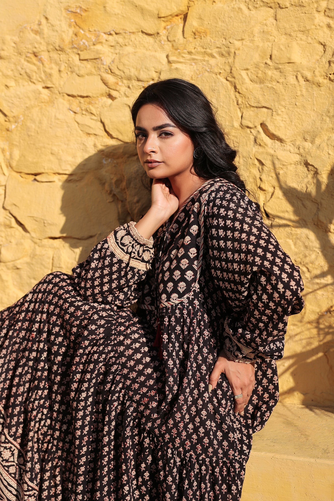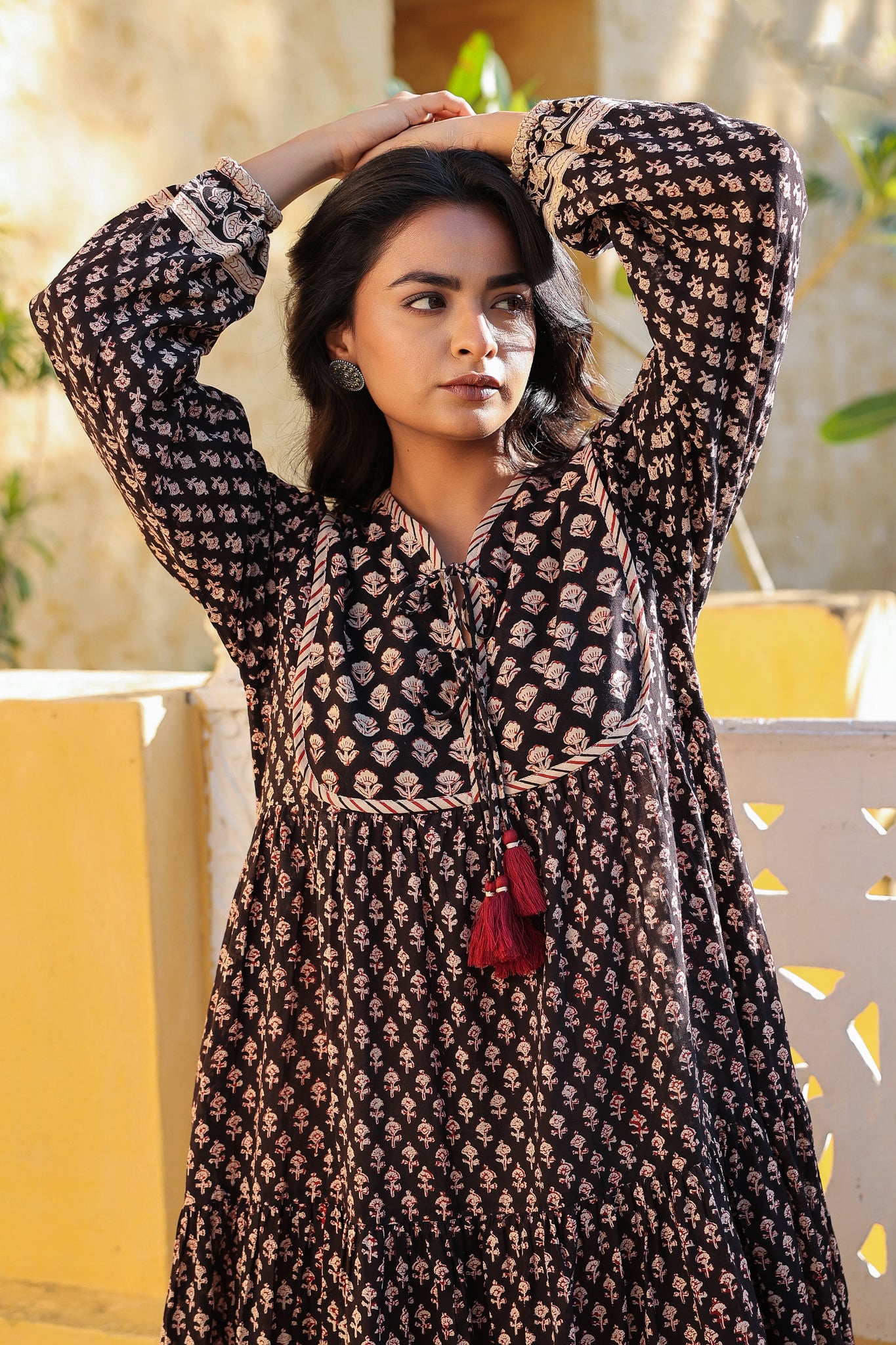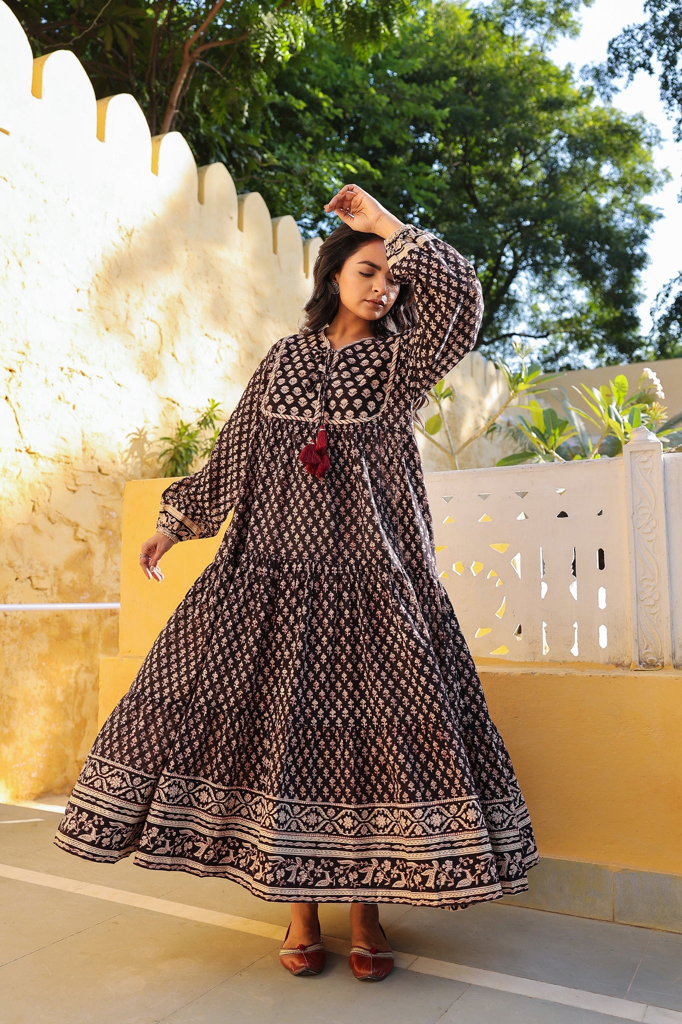 Hand block printed cotton maxi tiered dress with pockets and tassels.