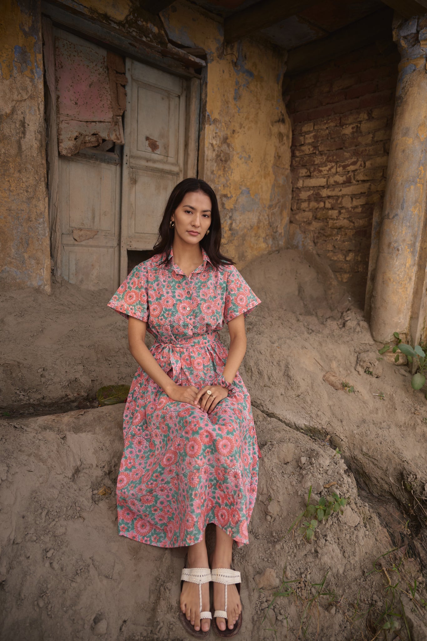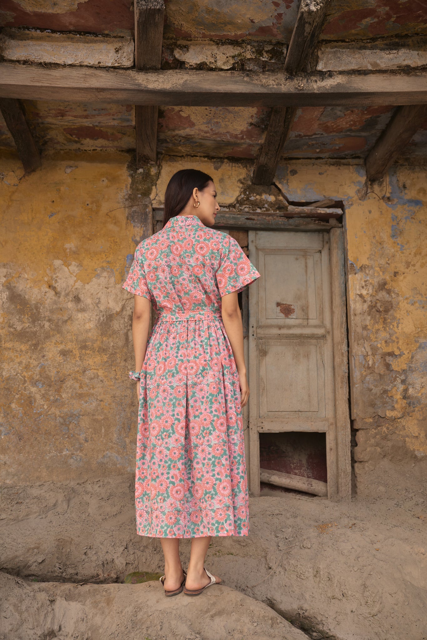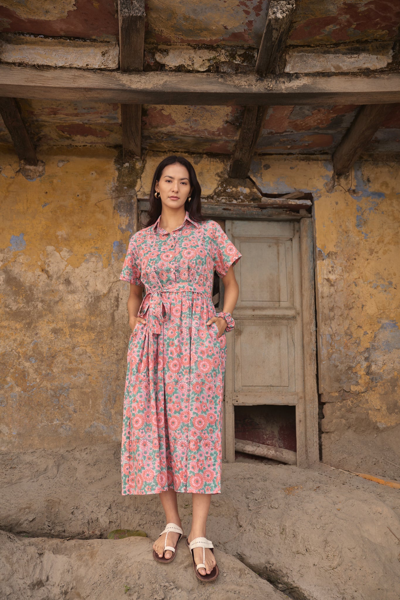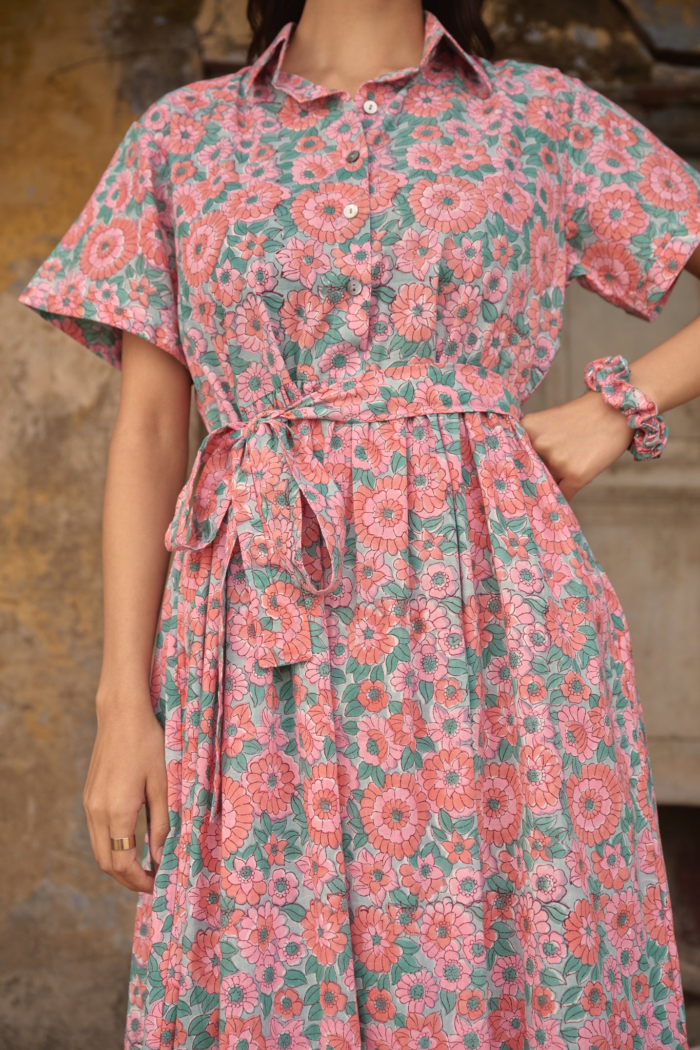 Hand block printed cotton midi dress, pleated , has pockets and belt to tie at the waist!!