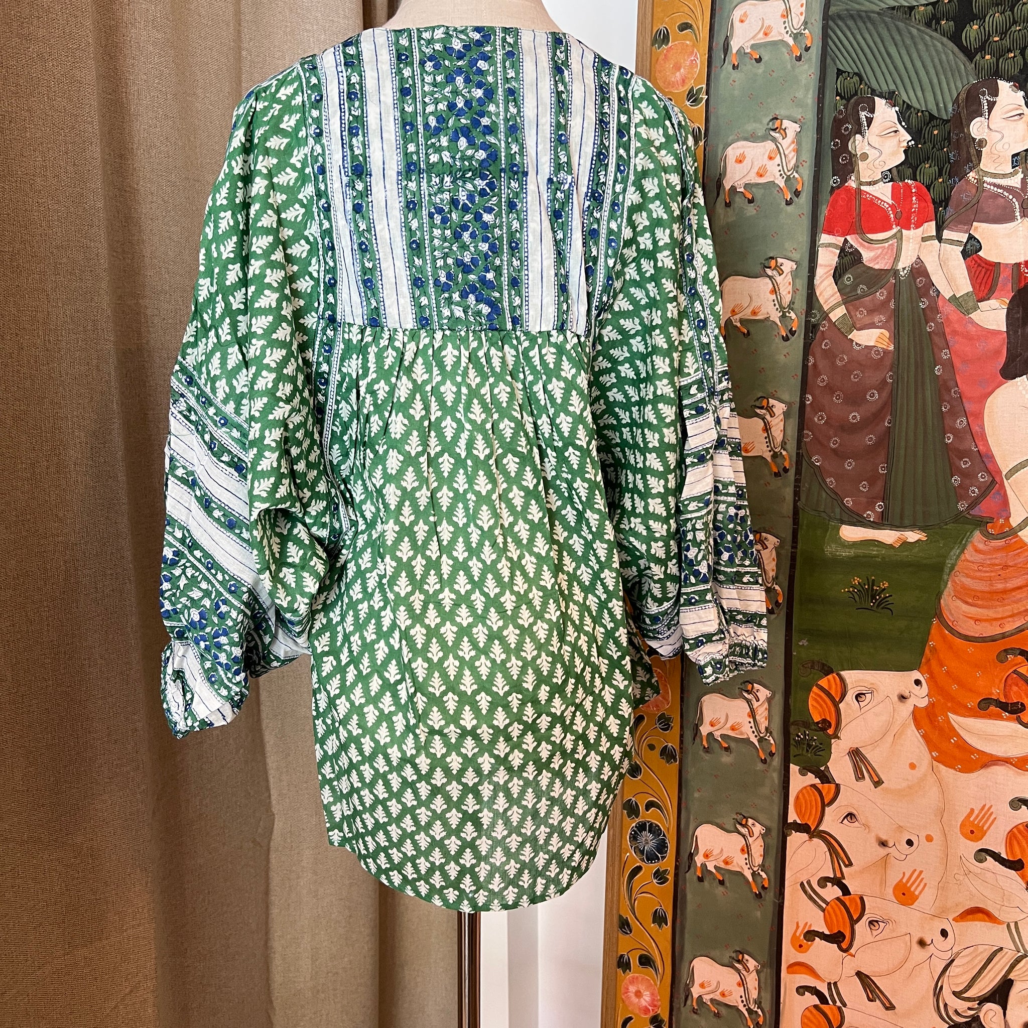 Hand block printed boho top. Balloon sleeves, boho fit, tassels and yoke. Highly recommended to try this in store!!