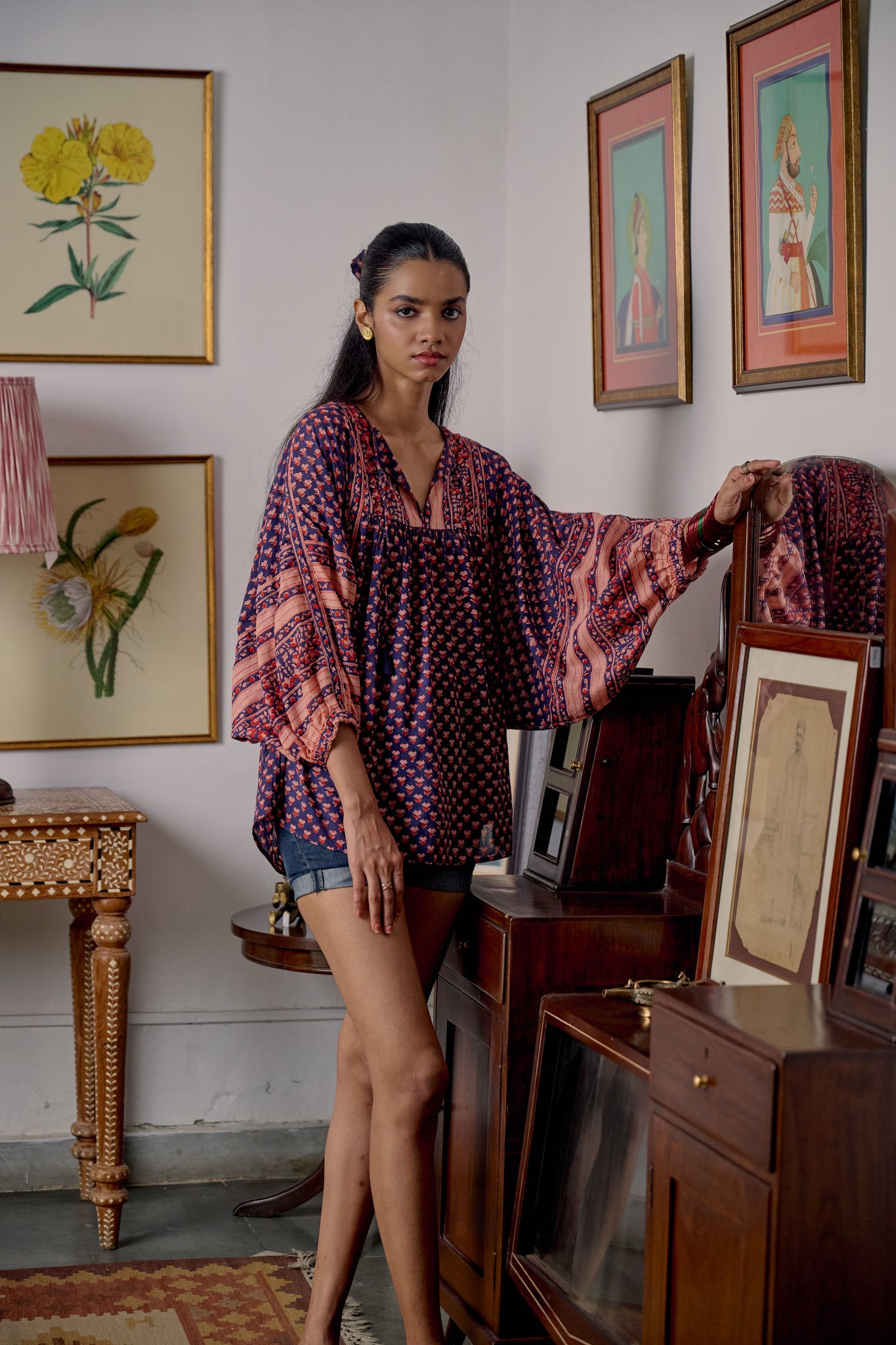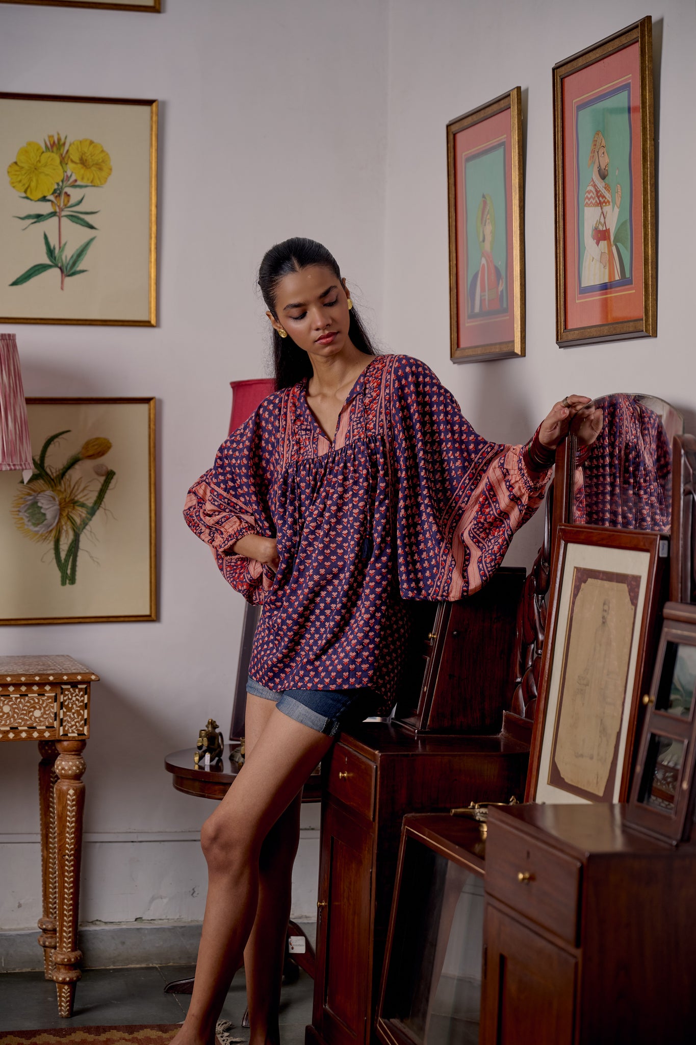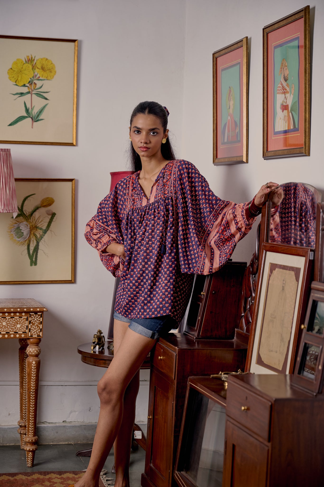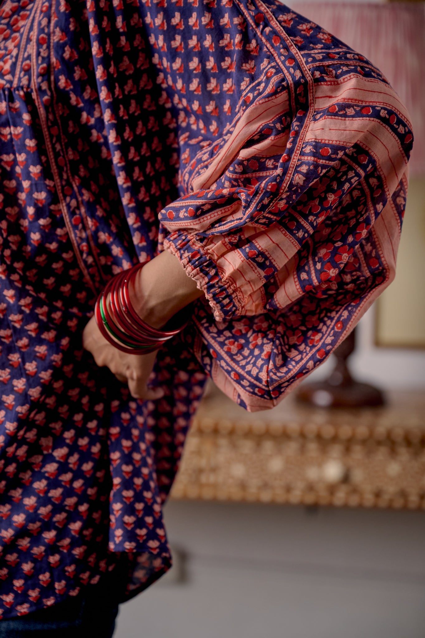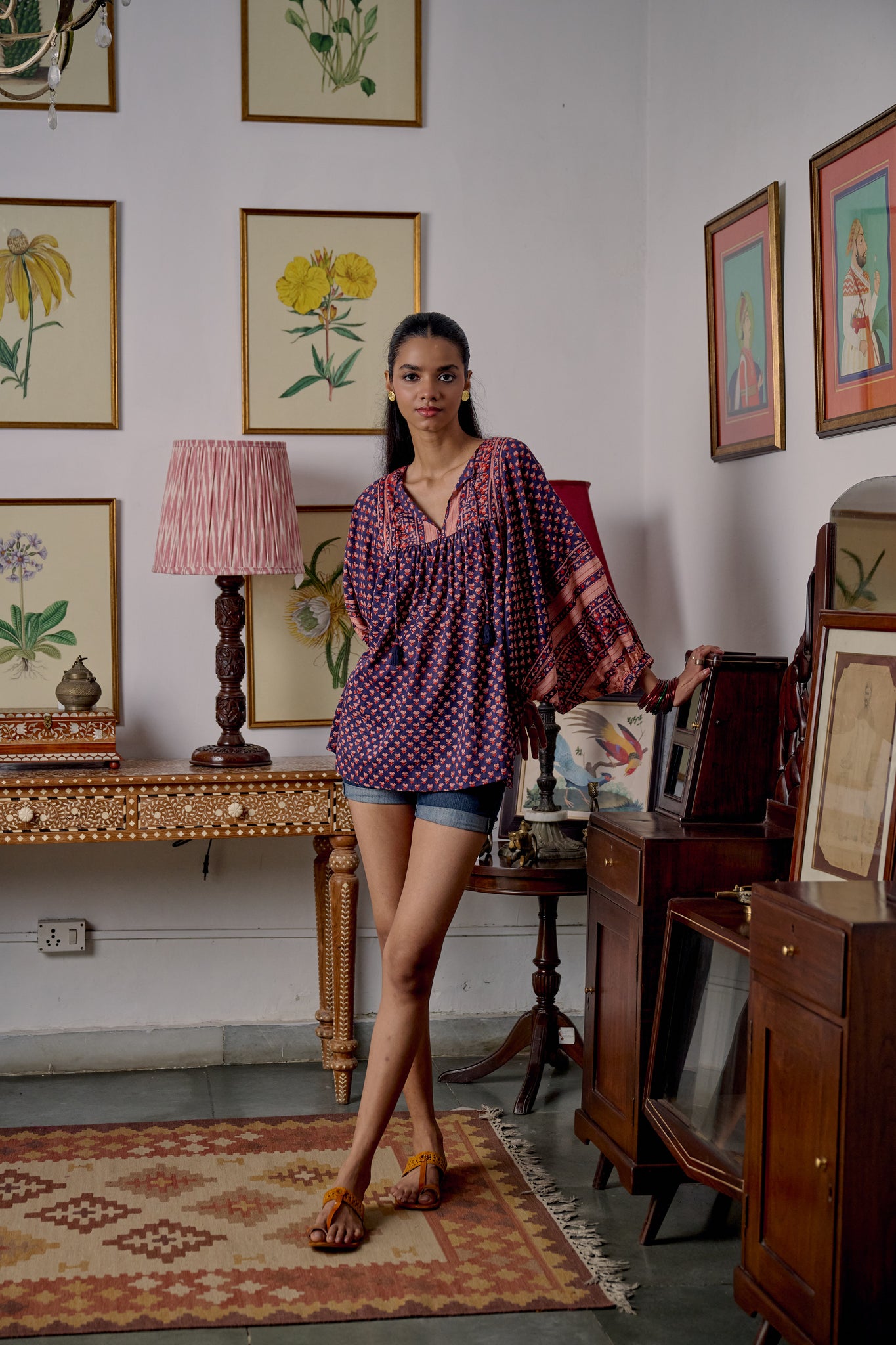 Hand block printed boho top. Balloon sleeves, boho fit, tassels and yoke. Highly recommended to try this in store!!